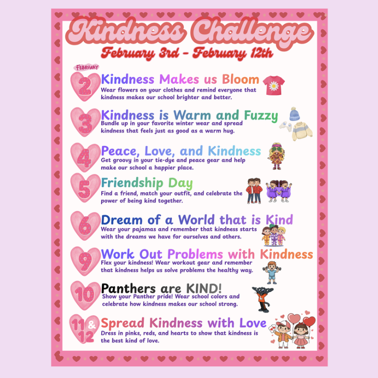 Time for the Kindness Challenge! February 3rd- 12th. Check out the schedule to see what ot wear!
