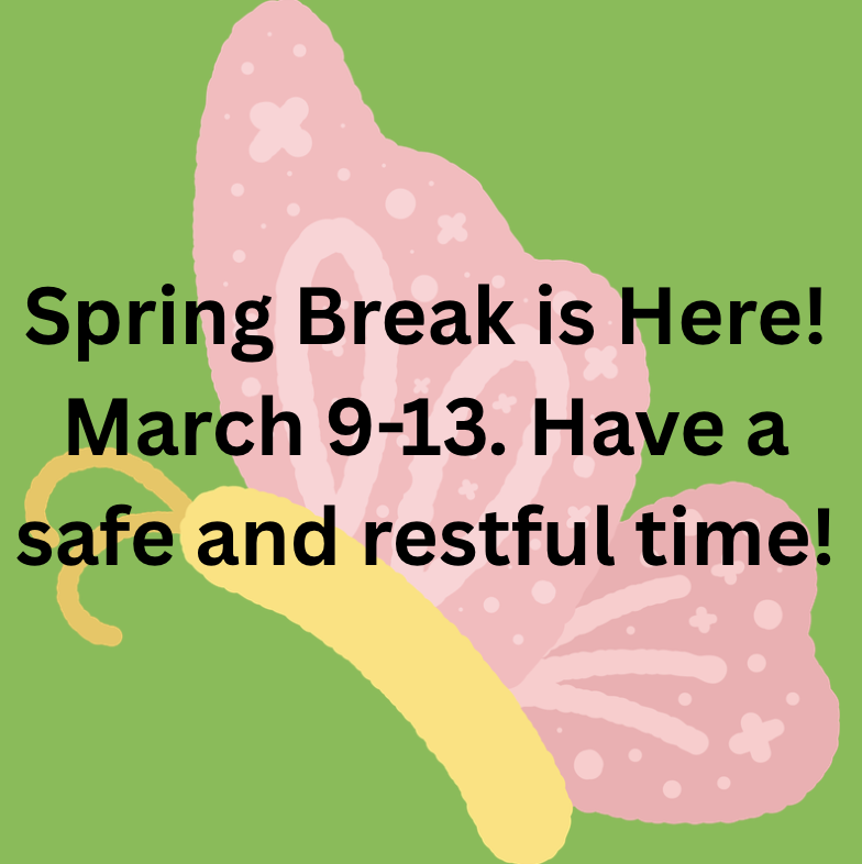 Spring Break is March 9-13. We hope you have a safe and restful break! We look forward to seeing you when we go back to school!